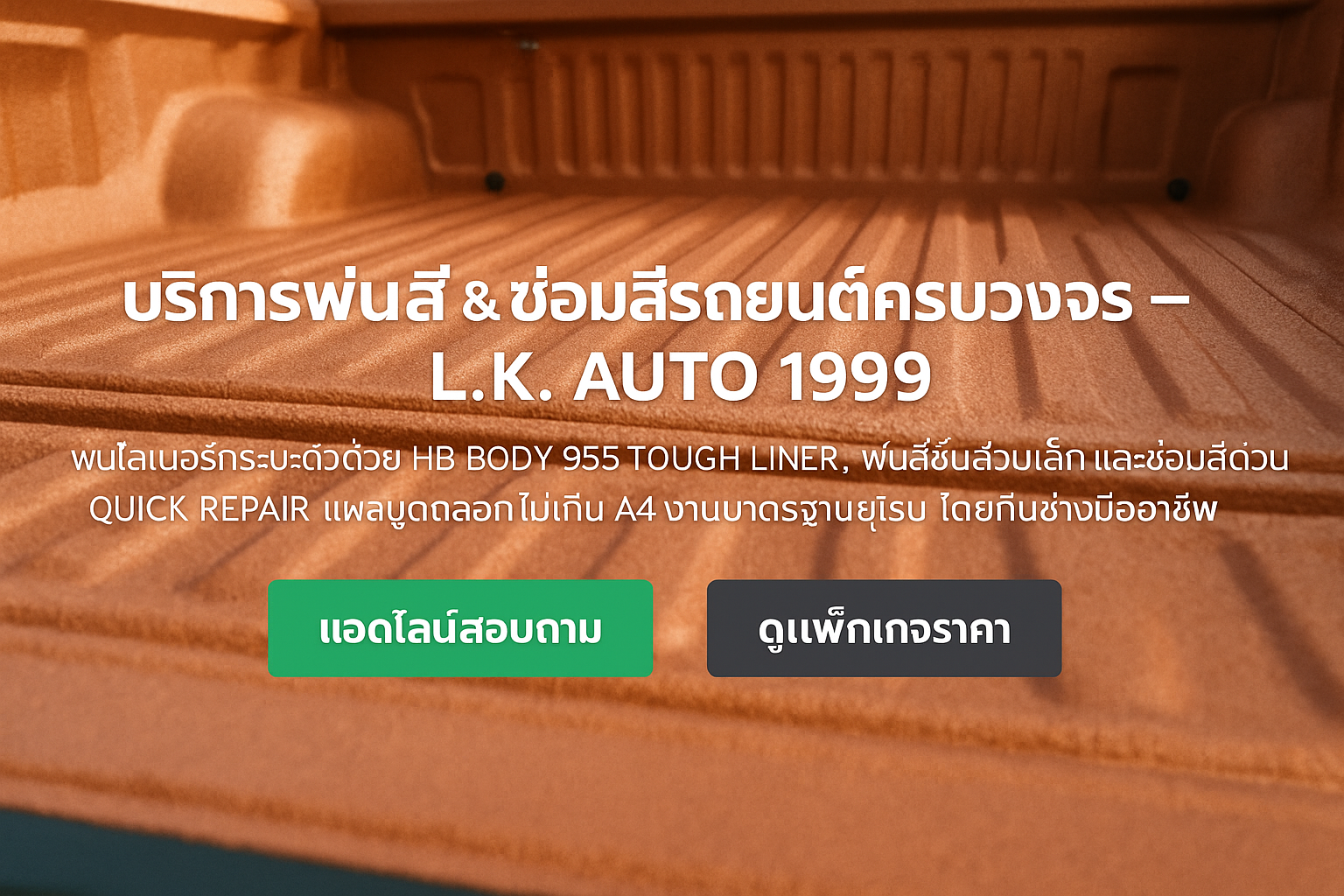 พ่นไลเนอร์กระบะด้วย HB BODY 955 TOUGH LINER, พ่นสีชิ้นส่วนเล็ก และซ่อมสีด่วน QUICK REPAIR แผลขูดถลอกไม่เกิน A4 งานมาตรฐานยุโรป โดยทีมช่างมืออาชีพ
