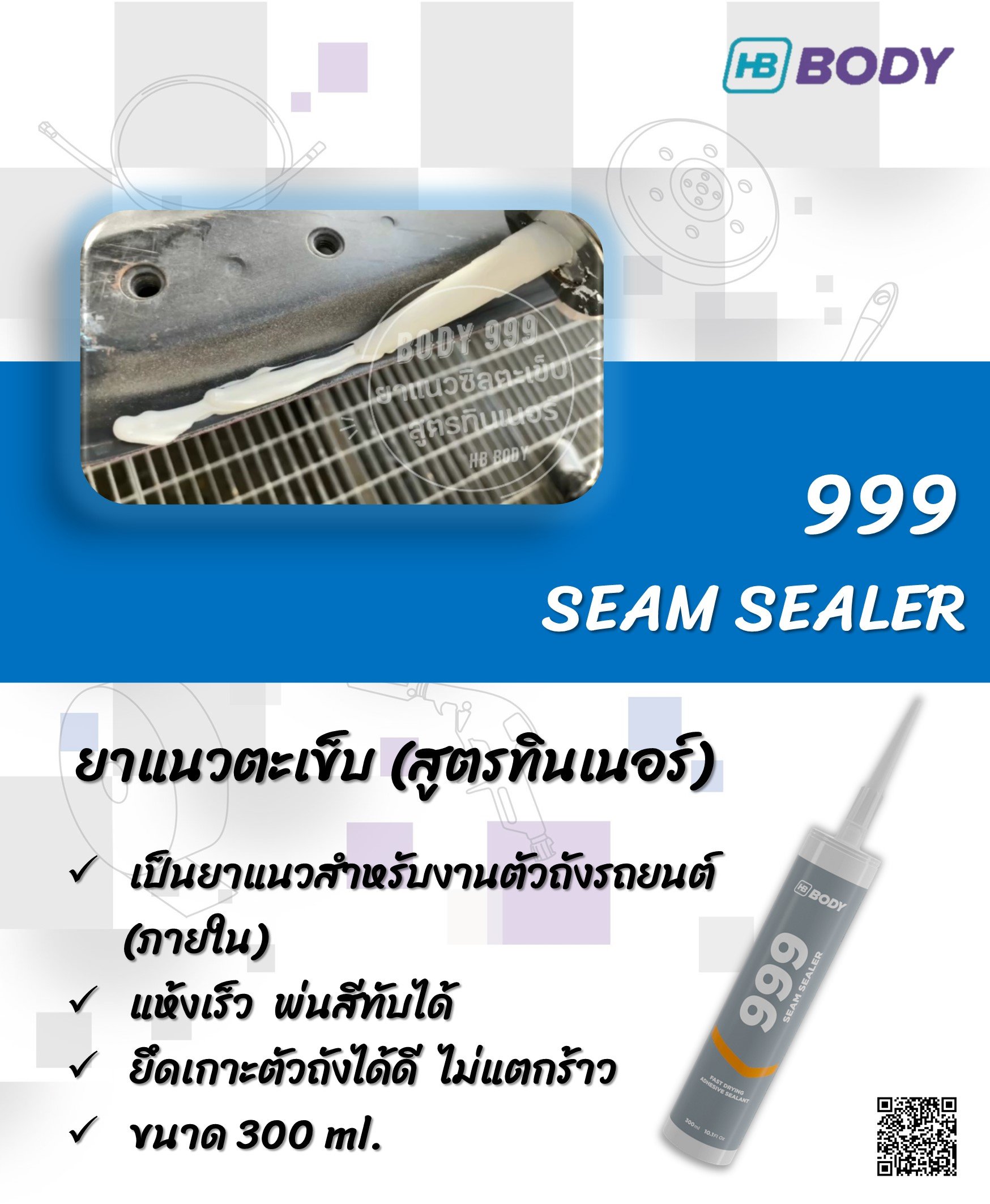 ยาแนวซินตะเข็บภายใน สูตรทินเนอร์ เหมาะสำหรับพื้นผิวโลหะและรอยต่อของตัวถังรถยนต์ ให้การป้องกันเสียงและกันน้ำ สามารถพ่นสีทับได้กับระบบสี HB BODY ทุกชนิด แห้งเร็ว ทนต่อแรงกลและสารเคมี